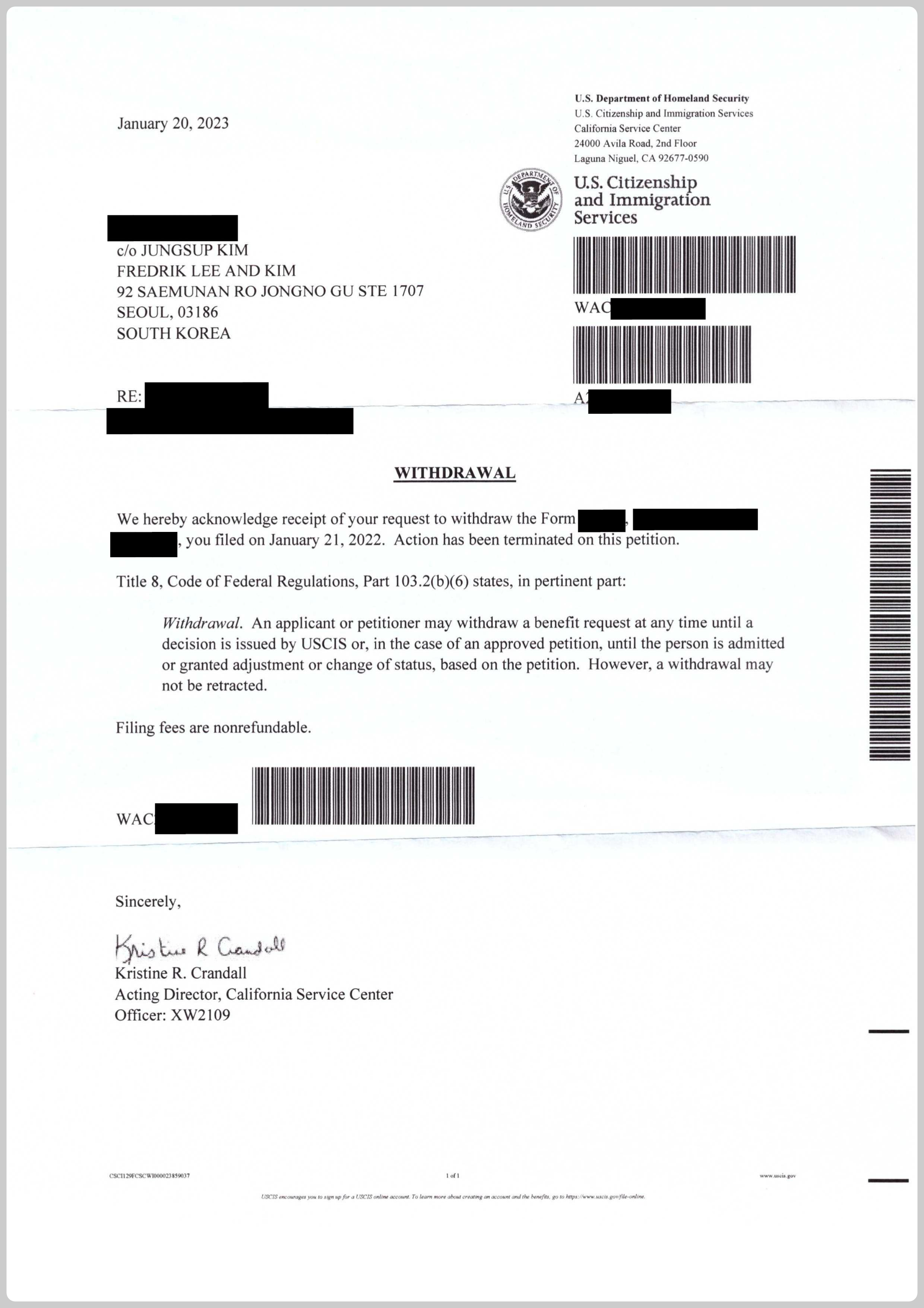 어떻게 해결해야 할까요? 현재 이민청원 신청 상태(case status)가 어떤지에 따라 대처 방법이 틀립니다만, 그중 한 방법이 미국이민국에 이민청원 철회 신청을 하는 것입니다. 아래는 신청 철회를 하고 이민국에서 받은 확인 편지 입니다. 이 편지를 제출해야 비자가 나오겠죠?