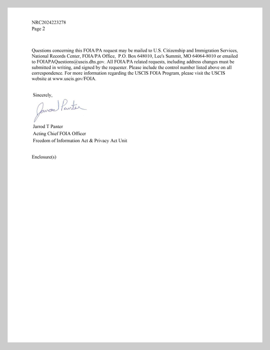 전문적이고 체계적인 질문과 요청방법을 통해 필요한 모든 기록(총 71 페이지)을 입수하는데 성공하였습니다. 아래는 미국이민국이 모든 기록을 공개하겠다고 하고, 모든 자료와 함께 보낸 cover letter 입니다.