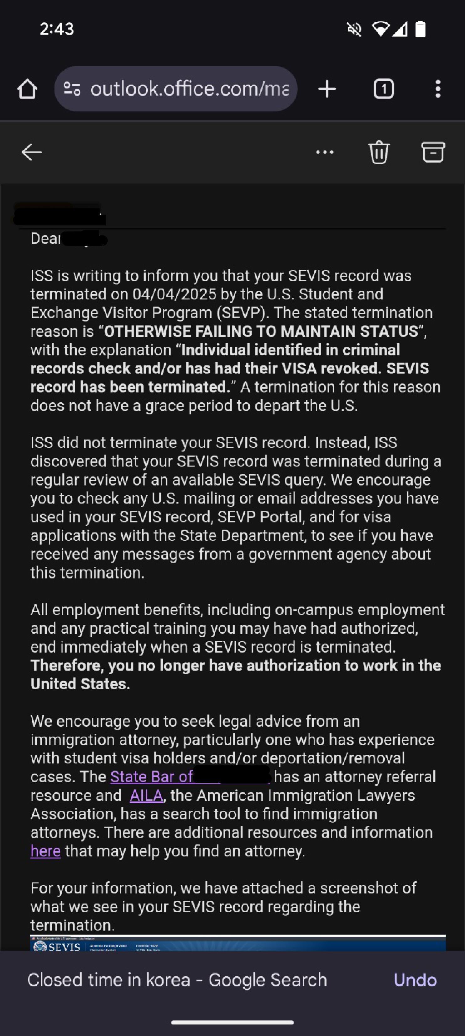 요즈음, 범죄경력자로 소명후, 비자를 받아서 나가신 분들중 갑자기 비자가 취소되거나 SEVIS 가 종료되어 곤란해 하는 경우가 보고되고 있습니다. 지금까지 보기 어려웠던 일들이라서, 트럼프행정부의 새로운 조치가 아닌가 하는 조심스러운 의심을 해봅니다. 아래는 학생비자(F-1)으로 범죄경력(Criminal records)이 있으나, 작년에 저희 프레데릭리앤킴의 도움으로 소명후 학생비자를 성공적으로 받았으나 최근 SEVIS가 종료되었다는 통보를 받은 케이스입니다.