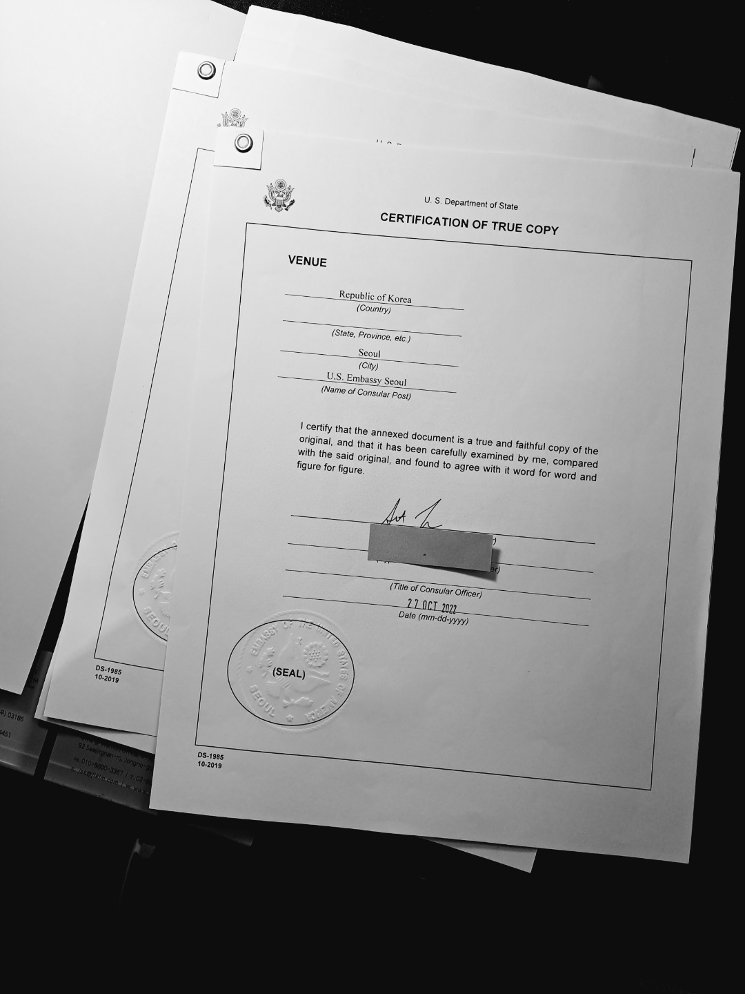미국대사관 발급 원본확인필증은 아래와 같이 생겼다....