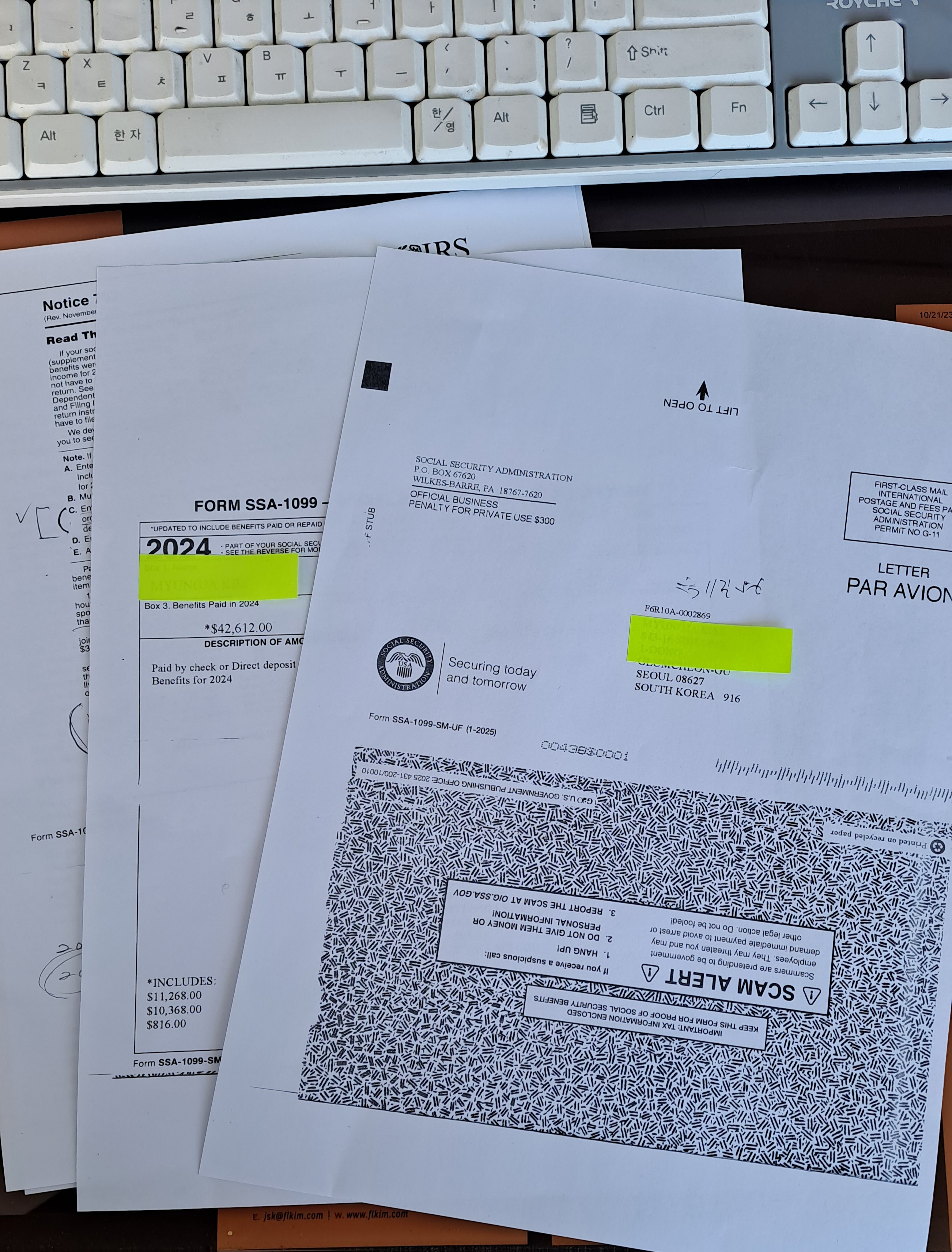 특히, 한국에서 사회보장 연금을 한국으로 이관하여 받으시고 있고, 사회보장연금 이외에 다른 소득이 있으신 분들, 또한 미국사회보장국(Social Security Administration)으로 부터 세금보고 관련 문서인 Form SSA-1099, Form SSA-1042S, Form RRB-1042S 를 받으신 분들은 반드시 전문가와 상담하시기를 권해드립니다.