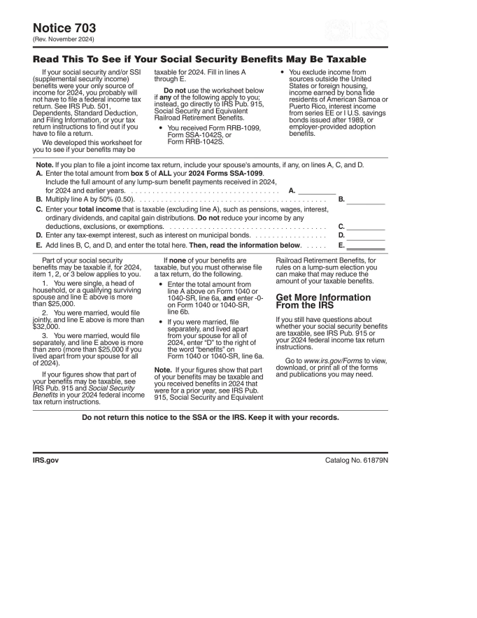 케이스별로 다를 수 있지만, 2025년 현재, 2024년 사회보장연금과 소득이 아래 공식을 이용 합계액이 미화 25,000불을 초과할 경우 세금보고를 해야합니다. (***더 상세한 내용은 아래 IRS Notice 703을 참조하시기 바랍니다.)