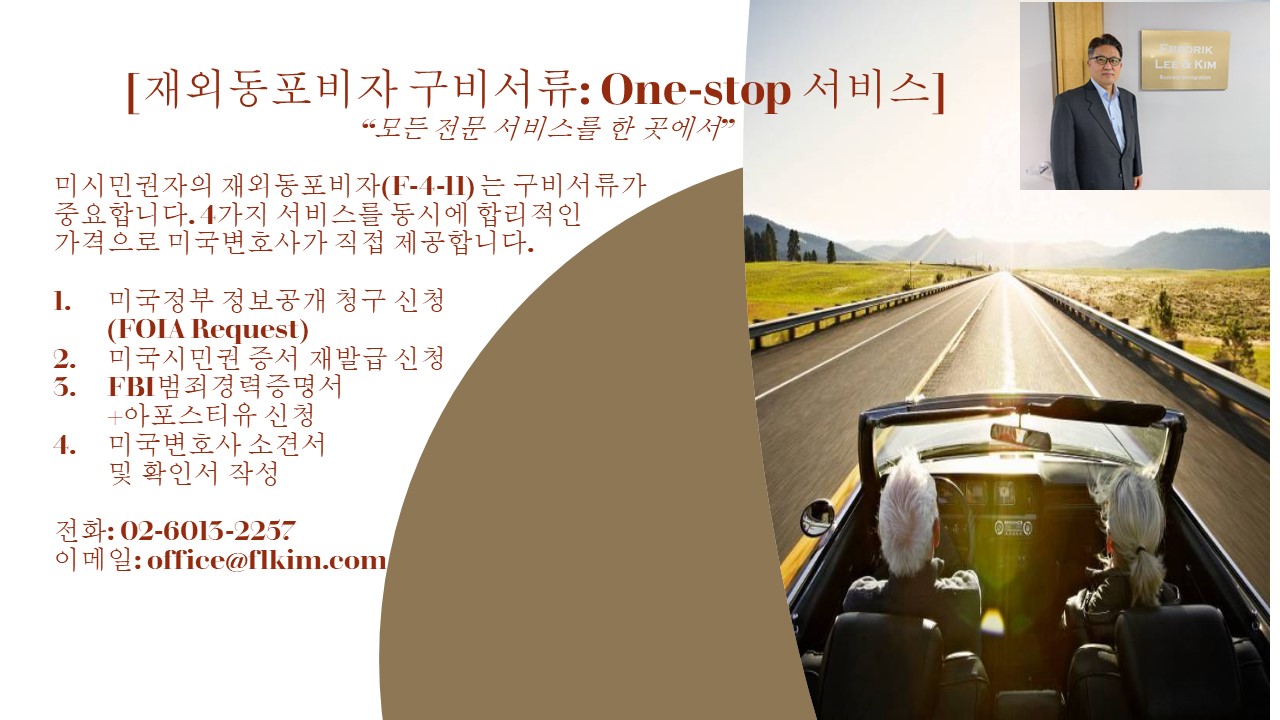 따라서, 이러한 분들을 위해 소위 "재외동포비자 구비서류 One-stop 서비스"를 제공하기로 했습니다. 프레데릭리앤킴에서 전문 미국변호사가 동시에 처리해 드리니 가격도 합리적이고, 처리 과정도 더 효율적일 수 밖에 없습니다.