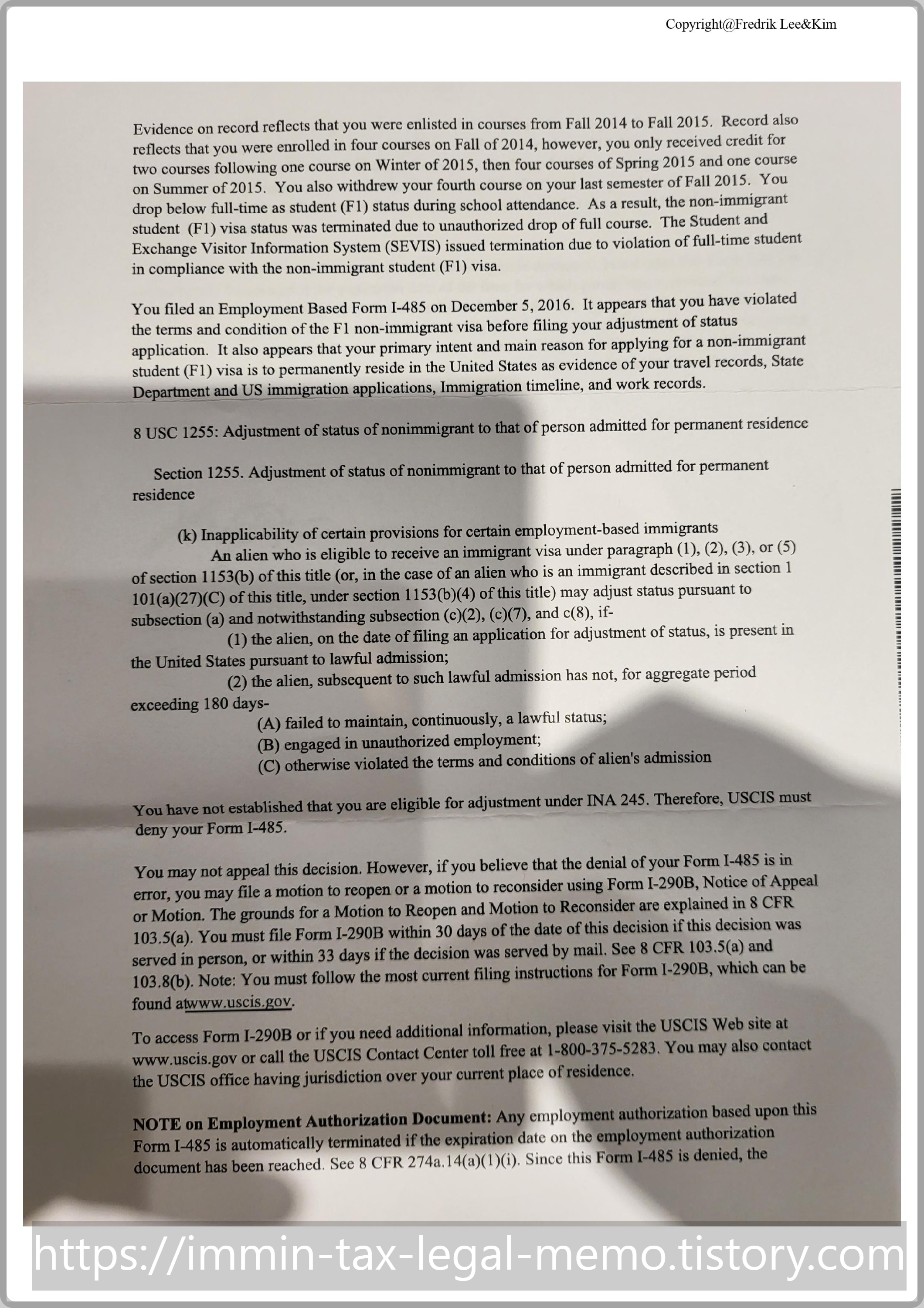 Evidence on record reflects that you were enlisted in coursed from Fall 2013 to Fall 2015. Record also reflects that you were enrolled in four courses on Fall of 2014, however, you only received credit for two courses following one course on Winter of 2015, then four coursed of Spring 2015 and one course Summer of 2015. You also withdraw your fourth course on your last semester of Fall 2015. You drop below full-time as student (F1) status during school attendance. As a result, the non-immigrant student (F1) visa satus was terminated due to unauthorized drop of full course. The Student and Exchange Visitor Information System (SEVIS) issued termination due to violation of full-time student in compliance with the non-immigrant student(F1) visa. [요약: 학생비자 해당 기간에 허락없이 full-time으로 학업을 유지하지 않아서 - 처음 4과목 신청했으나 결국 학기당 2과목 이하로 수강 -- 이민법상 학생비자 요건을 위반 했다.] You filed an Employment Based Form ... It appears that you have violated the terms and conditions of the F1 non-immigrant visa before filing your ... application. It also appears that your primary intent and main reason for applying for a non-immigrant student (F1) visa is to permanently reside in the United States as evidence of your travel records, State Department and US immigration application, Immigration timeline, and work records. [요약: 영주권 신청 전에 학생비자 요건을 위반 했고, 너의 학생비자 신청의 주요 동기가 -- 모든 관련 기록들을 볼때 -- 미국에 영주하려는 것으로 보인다] |