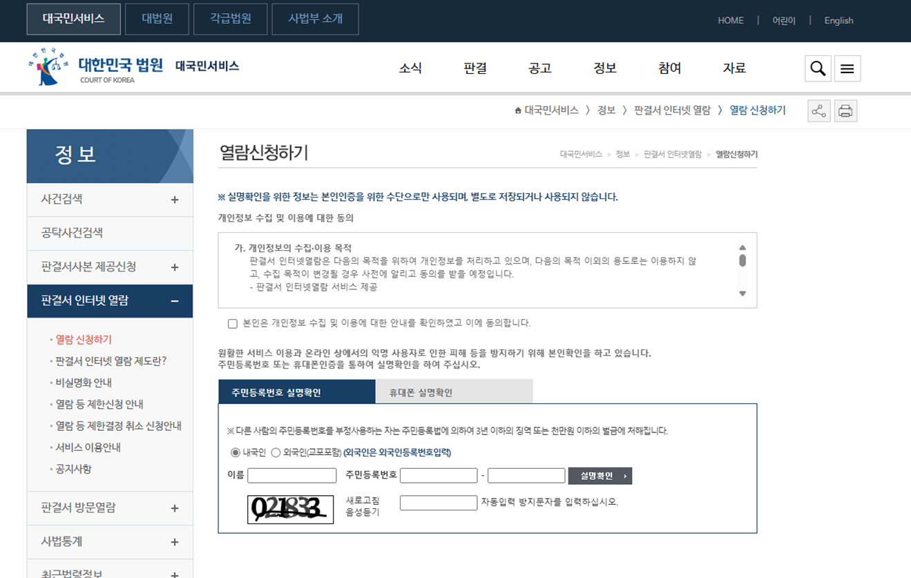 ** 한국의 경우 대부분의 기록을 인터넷(http://www.scourt.go.kr 등) 을 통해 입수하실 수 있습니다. **