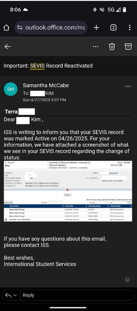 많은 미국이민변호사님들의 신속한 대처와 노력(정식회복신청 또는 연방정부 상대로 소송)으로 대부분 법원에서 트럼프행정부의 학생비자 취소결정이 불법이라고 결론이 났으며, 트럼프행정부가 법원의 결정예 따라, 대폭 취소했던 학생비자 또는 SEVIS 를 다시 원상복귀하기로 결정하고 시행중입니다. 저희도 클라이언트 들로 부터 속속 그 결과를 보고 받고 있습니다 (위 사진참조). 정말 다행입니다.